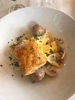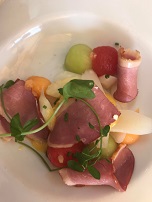 Starter duck and melon ; Fish main course ; Vol-au-vent main course ; Strawberry meringue ice-cream desert